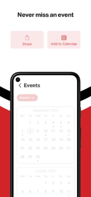 NEVER MISS AN EVENT The event section shows a list of events throughout the district. Users can add an event to their calendar to share the event with friends and family with one tap.
