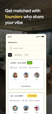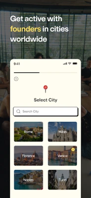 • Sign up with your city and interests—we’ll match you with three other founders nearby.